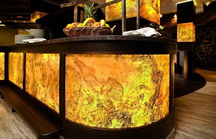 Можно воплощать любую фантазию собственника. От любого рисунка мрамора до картин на фоне камня